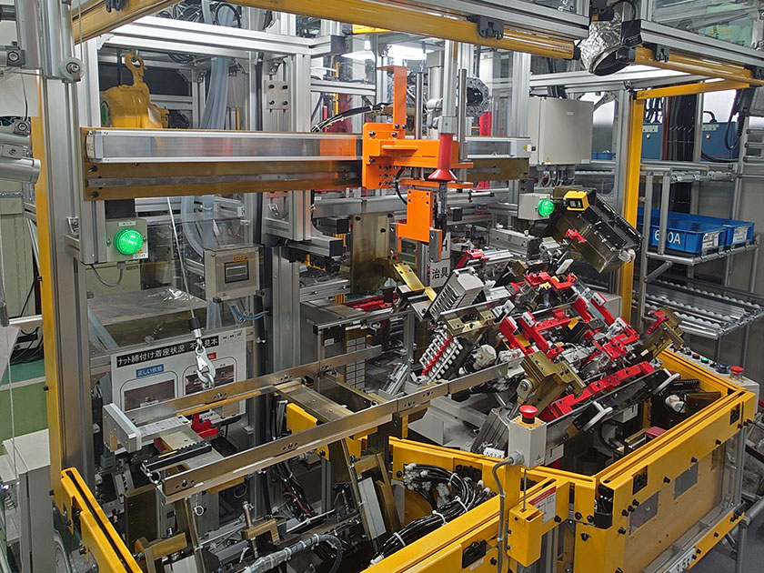 溶接後の骨格フレームとシートトラックを、ナットランナーにて自動で締結する設備。設備能力向上の為、ターンテーブル仕様。